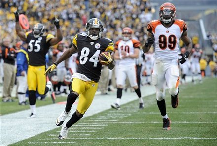 Pittsburgh Steelers wide receiver Antonio Brown (84) returns a punt for a 60-yard touchdown past Cincinnati Bengals’ Manny Lawson