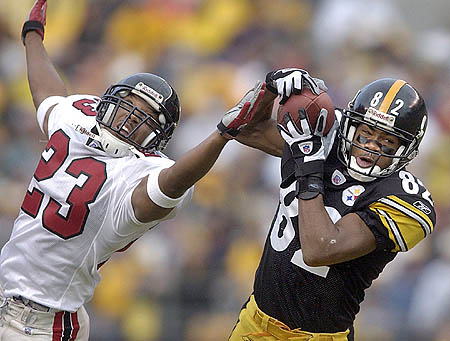 Atlanta wouldn’t go down easily, as Warrick Dunn put on a show in the second half. It started with him going for a score from 59 yards out to make it 17-14. But Maddox, again playing the gunslinger, found Burress again, this time from 62 yards out to put the Steelers back out in front 23-14 after the extra point was blocked.