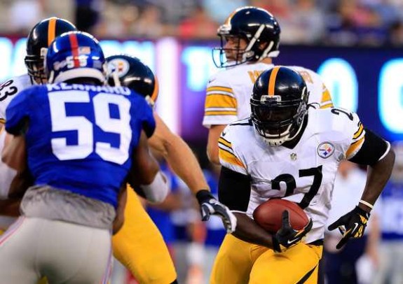 Running back LeGarrette Blount #27 of the Pittsburgh Steelers carries the ball against the New York Giants during a preseason game at MetLife Stadium on August 9, 2014 in East Rutherford, New Jersey.