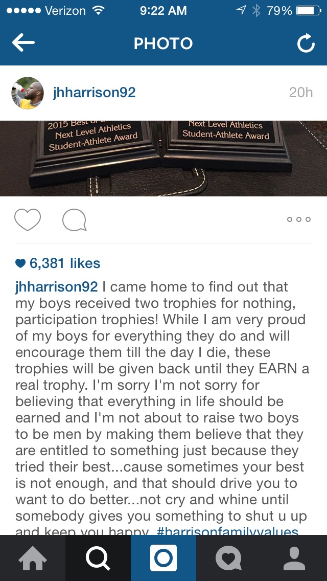 The linebacker put out on Instagram a pic of his kids “participation” trophies, and how he was giving them back.