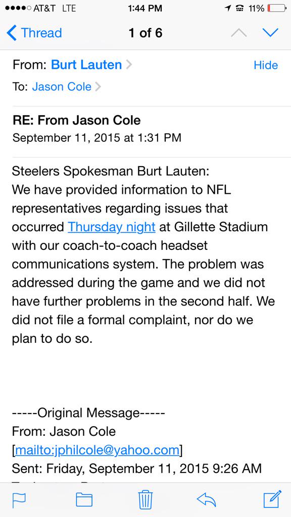 Jay has it right. According to reports, the NFL not only provides the headsets but has an employee handling radio frequencies at all stadiums (not just Foxborough). Apparently, similar problems have occurred at Heinz Field. There isn’t enough bandwidth for all the users. In short, the Steelers have no basis for a complaint.