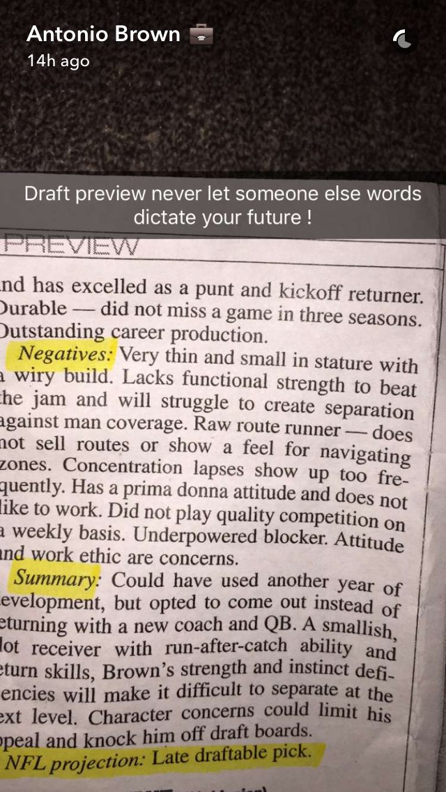 Brown posts daily videos and pictures to his Snapchat page where millions of people can view them to see his daily life. Yesterday he posted an old draft scouting report from 2010 where someone had written about him.