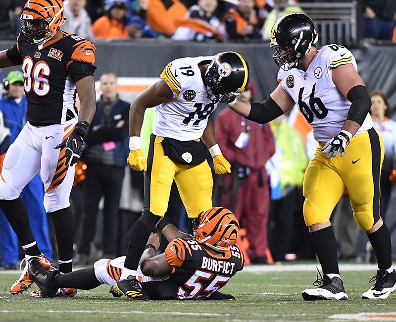 JuJu Smith-Shusters hit on Burfect was legal and not blind sided as reported. If it was blind sided then Burfect is blind in both eyes as it came from the front with his shoulder to Burfects chest. If he had a head injury it was because he hit the turf hard head first. He should have been penalized and fined for standing over him but not suspended. Now Gronks hit was dirty and should have gotten a bigger suspension than one game. There was 279 penalty yards and Pittsburgh had 69, what was Cinci’s total? Burfect taunted the kid the whole game and never expected a 20 yr. old kid could block like that.