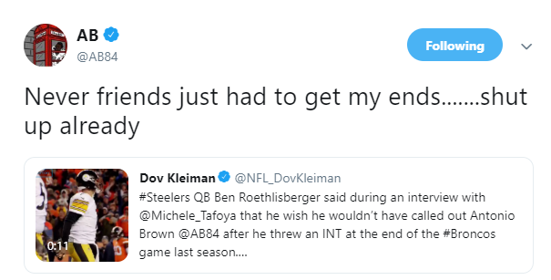 #Steelers QB Ben Roethlisberger said during an interview with @Michele_Tafoya that he wish he wouldn’t have called out Antonio Brown @AB84 after he threw an INT at the end of the #Broncos game last season.