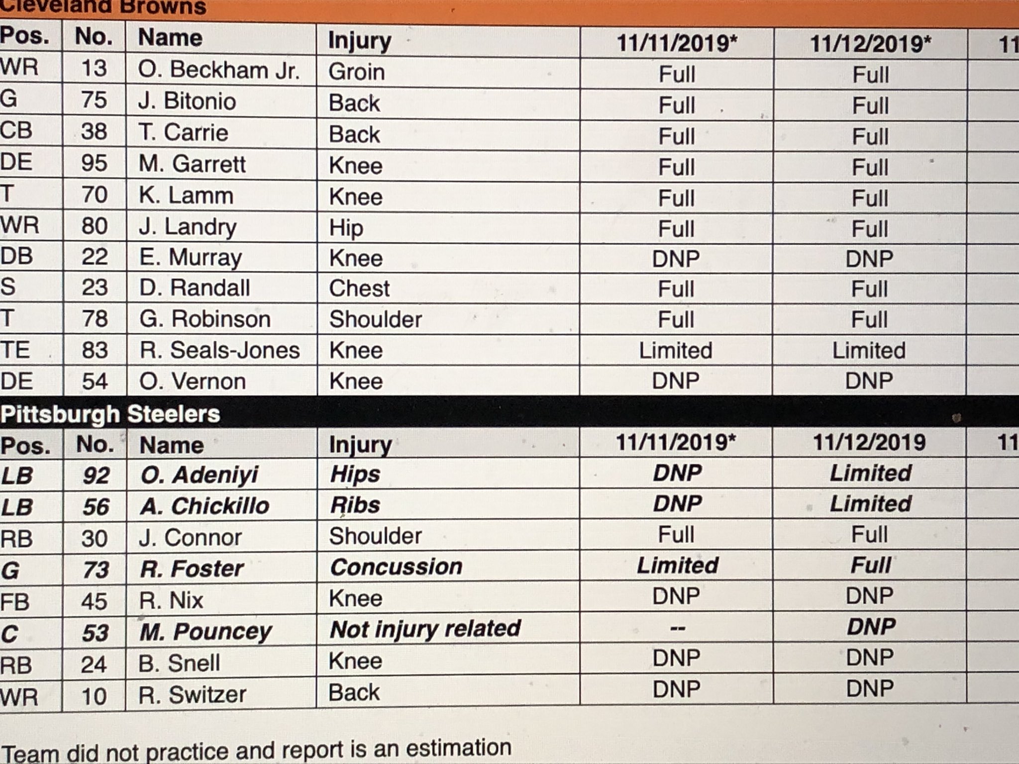 Tuesday Steelers at Browns Injury Report for Thursday’s Game