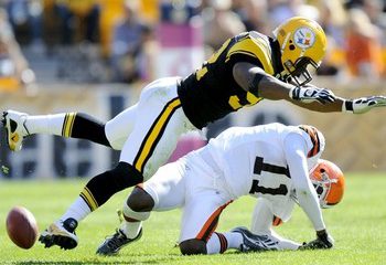 James Harrison lays out Browns WR Josh Cribbs in the Steelers 28-10 win over Cleveland Sunday at home.